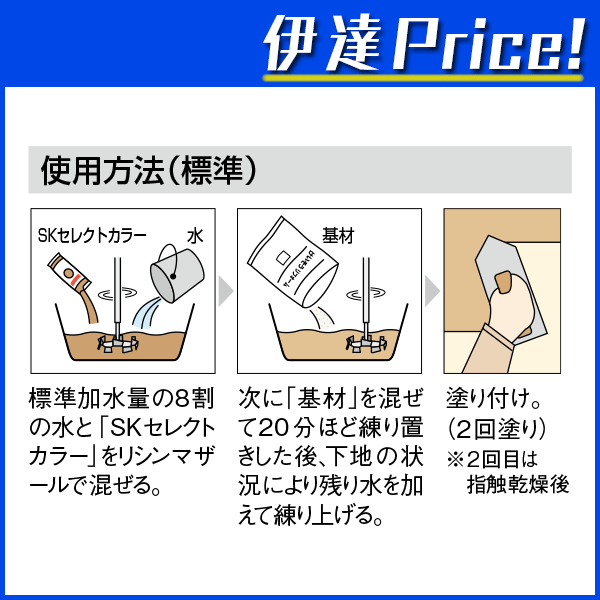 (2回塗り)※2回目は指触乾燥後 ■仕様■ 主成分:珪藻土・砂・パルプ 標準塗り厚:1.2〜2.5mm(模様付けにより異なる) 標準塗布面積:2.0〜3.3m2/袋(模様付けにより異なる) 正味質量:基材3600g/袋、SKセレクトカラー150g/袋 標準加水量:2.0リットル/袋(吹付けの場合は2.5リットル/袋) 適応下地:ボード用石膏プラスター、中塗土、セメントモルタル、古壁、ビニルクロス(汚れがひどい場合はシーラー処理が必要) ※選択肢4つの中からいずれか1色のみご選択ください。