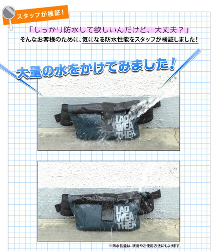 メーカー希望小売価格はメーカーサイトに基づいて掲載していますLAD WEATHER ラドウェザー 防水ウエストポーチ大人気アウトドア・ブランド「LAD WEATHER」から便利なウエストポーチがNEWアイテムとして登場!気になる性能と、その魅力をスタッフが徹底的に調査しました!検証動画もあるので、防水性能をチェック!!防水力の秘密とは?高い防水力の秘密は、丈夫で軽量、耐水性に優れた「TPUターポリン」を素材に使用しているから。