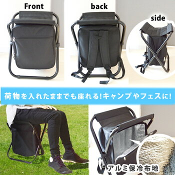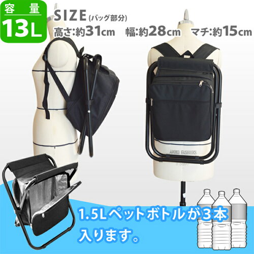 たくさん入るリュックが折りたたみ椅子にもなっている!! 疲れたら座れるので、行列時の待ち時間やこれからの季節のアウトドア、フェスなど使用シーンはさまざま!! 1.5リットルのペットボトルが3本も入る大容量で大満足の折りたたみ椅子 中生地はアルミ保冷布地なので釣り用品としても便利です!! キャンプなどされる方にオススメしたい2WAYの便利グッズです!! <サイズ> (バッグ部分)約31cm×約28cm×約15cm イスにした時の高さ:約42cm×約28cm×幅約25cm (折りたたみ時)全長:約49cm× 幅:約36cm 重量:約1.3kg 耐荷重約100kg(均等に荷重している場合のみ) ※多少の傷・汚れはご了承下さい。